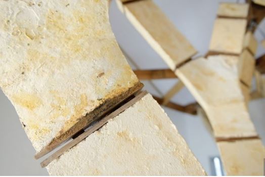 Dans les expérimentations mycologiques présentées dans la galerie, la scénographie met au cœur du travail le processus de fabrication du mycélium et donne à voir les textures, les reliefs, les nuances et les variabilités possibles de ce matériau fongique. Tests, échantillons, prototypes sont exposés sous nos yeux. On s’y approche, on s’y penche, on l’observe, toujours en tentant de comprendre comment le mycélium se ramifie, se solidifie, se moule et s’étire. Ici, le matériau de construction s’admire, se regarde et s’élève au rang de matière noble par ses caractéristiques vivantes et organiques.
