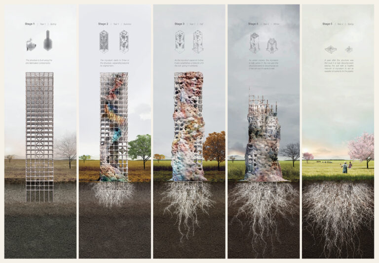 Récompensé par une mention honorable lors du concours « Skyscraper Competition » en 2021, le projet Terra Mycelia, conçu par une équipe espagnole et suédoise, s’attaque à l’un des défis cruciaux de notre époque : la dégradation rapide des terres. Environ 25 % des terres sont déjà dégradées et cela s’intensifie à un rythme alarmant : 90 % de dégradation d’ici 2050 sont à envisager. Cela est notamment dû à l’agriculture industrielle intensive, répandant pesticides, engrais chimiques et herbicides, dénaturant ainsi les terres.