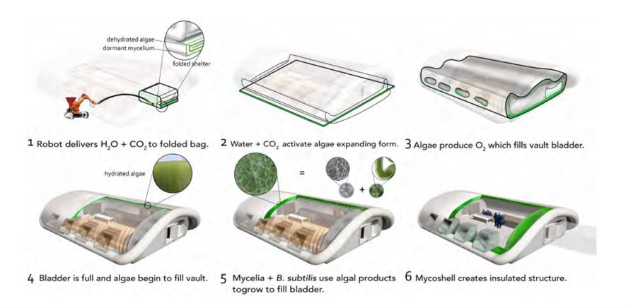 Une équipe de chercheurs de l’Université Cornell aux États-Unis et du centre de recherche Ames de la Silicon Valley en Californie travaille sur des prototypes d’habitats inspirés de la biologie synthétique. Le concept repose sur l’idée de transporter des sacs hermétiques contenant des microbes et des spores sur la planète rouge. Une fois sur place, un robot ajoute de l’eau et de l’oxygène, créant ainsi les conditions propices au développement d’algues capables de produire de la biomasse et de l’oxygène. Ces algues nourrissent ensuite les champignons qui, grâce à leur croissance rapide, structurent une matière solide pour créer des habitats pour les astronautes. Ces habitats pourraient non seulement s’agrandir et se réparer de manière autonome, mais aussi disparaître complètement de manière naturelle, laissant ainsi Mars intacte.
