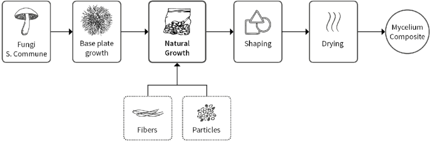 Le processus de fabrication du mycélium implique plusieurs étapes. Tout d’abord, une pasteurisation et un nettoyage rigoureux de l’environnement de fabrication sont essentiels pour éviter la contamination par d’autres bactéries ou moisissures. Les matériaux nécessaires à la production, tels que le carton ou la paille, sont pasteurisés avant d’être mis en contact avec le mycélium lors de la phase d’incubation. Celui-ci se développe et se lie alors à la matière, formant peu à peu un seul et même composant. Pour générer des formes spécifiques, des moules peuvent être utilisés afin de contenir le développement du mycélium. Une fois la croissance considérée « terminée », il suffit d’assécher le mycélium, qui entre alors dans une phase « d’endormissement », prêt à être réveillé avec la bonne dose d’humidité.
