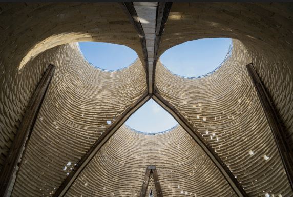 La tour, composée de 10 000 briques innovantes cultivées à partir de tiges de maïs et de champignons, sert alors de refuge ombragé au niveau du parvis pour les visiteurs du musée. Véritable révolution esthétique et architecturale, elle exploite pleinement les possibilités offertes par le mycélium. Les ouvertures zénithales, les cheminées et les parois en moucharabieh permettent non seulement de filtrer la lumière, mais favorisent également la ventilation naturelle, créant ainsi un environnement bioclimatique optimal. La Hy-Fi Tower incarne une véritable prouesse contemporaine en matière d’architecture durable et démontre les capacités de la brique de mycélium dans une envergure de nouvelle dimension : 12 mètres de hauteur de matière vivante.