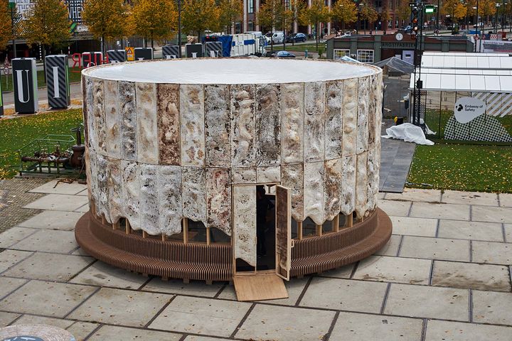 En 2019, lors de la Dutch Design Week, l’innovation architecturale a franchi une nouvelle étape avec la présentation du « Growing Pavilion » par Krown-design. Ce projet a révélé les incroyables possibilités offertes par une nouvelle architecture respectueuse de l’environnement. Constitué de panneaux en mycélium, cultivés par l’entreprise spécialisée Grown Bio, chaque panneau se distingue par sa forme unique, ses reliefs et ses teintes. Cette approche novatrice repousse les limites de la créativité architecturale en utilisant le mycélium comme matériau de base pour la construction. Ce Pavillon écologique incarne à lui seul la fusion entre l’art, la durabilité et l’ingéniosité, ouvrant ainsi la voie à de nouvelles possibilités d’écoconstructions.