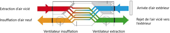 En été, l’échangeur de la VMC a aussi son utilité, car il va récupérer la fraicheur dans le bâtiment pour la transmettre à l’air chaud extérieur.