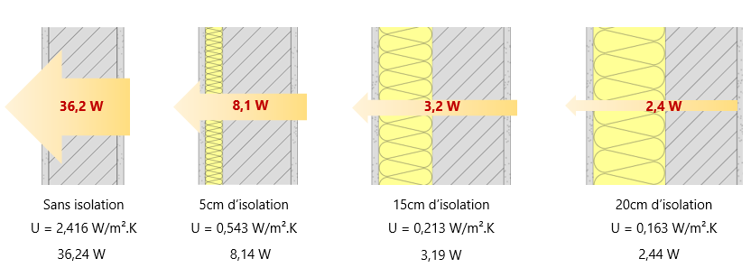 La première chose à faire, la plus efficace et la plus rentable, est d’isoler, c’est-à-dire rendre la paroi la moins conductrice de chaleur. Prenons un exemple avec 1m² de paroi et une différence de température entre l’intérieur (20°C) et l’extérieur (5°C) de 15°C. Nous avons les déperditions suivantes :