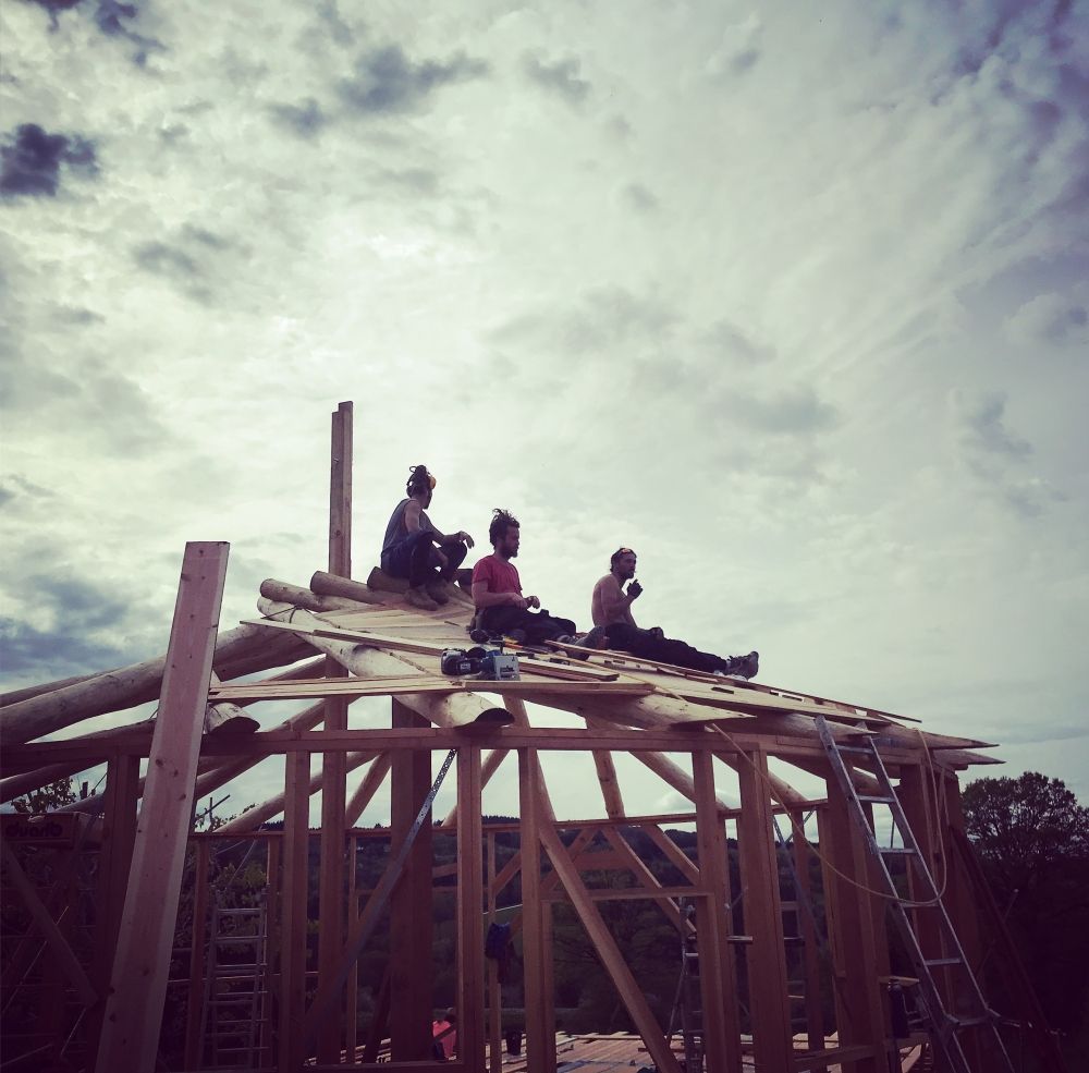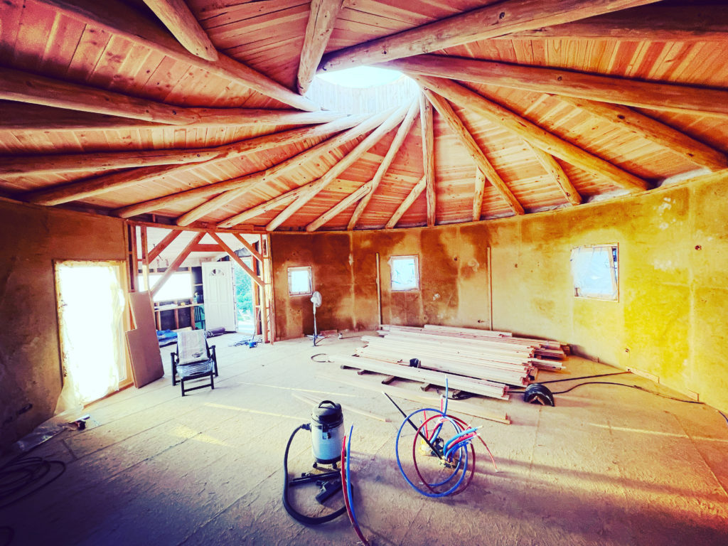 « La maison, on ne la remarque presque pas dans ce tableau, aussi parce qu’elle a été conçu avec les matériaux du coin. La charpente en tronc d’arbre, en plus d’être incroyablement belle, s’auto-porte, un peu comme un système de voute : ce qui permet de ne pas avoir de poteaux au centre de l’espace. Les murs ossature-bois sont isolés avec de la paille et la finition est un enduit chaux-sable. Comme je l’ai dit, la yourte n’est qu’accessoire dans le paysage. Quand elle sera terminée je la couvrirais de fleurs pour qu’elle se noie dans le décor. Je voulais une maison ronde, parce que j’adore cette forme ! Les dimensions sont basées sur le chiffre d’or, pour moi ça faisait sens. L’énergie de la forme et les vibrations qu’elle dégage la rendent très jolie. Lorsque j’étais dans cette période de recherche intense sur mes valeurs et ce que je voulais faire, j’ai passé de nombreuses heures sur internet. C’est comme ça que j’ai découvert le site d’HeliYourte [1]. Je suis tout de suite tombé amoureuse du concept. Ils m’ont aidé dans la réalisation de cet habitat et on produit les dessins techniques. Pour l’intérieur, j’ai proposé un plan que j’avais ébauché avec une copine architecte. En tout la maison a 72m2 au sol, avec deux chambres correctes, un grand salon avec une cuisine ouverte, une petite salle de bain et un toilette séparé. »