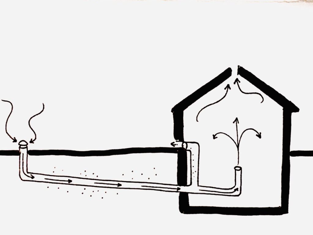 Le principe astucieux peut se faire lorsque le site associé au projet le permet, puisqu’il requiert l’élaboration d’une tranchée pouvant aller de 25 à 50 mètres en longueur et d’une profondeur d’environ 2 mètres. Plus le circuit est long, plus l’air insufflé est tempéré. En effet, en s’enterrant l’installation profite de l’énergie de la terre, c’est un dispositif géothermique. La température stable du sol se situe aux alentours des 12°C, elle varie légèrement selon les saisons ou les régions. En passant dans la gaine enterrée, l’air environnant aspiré par la borne extérieure, se refroidit ou se réchauffe suivant l’époque de l’année, avant d’être éconduit dans les espaces intérieurs.