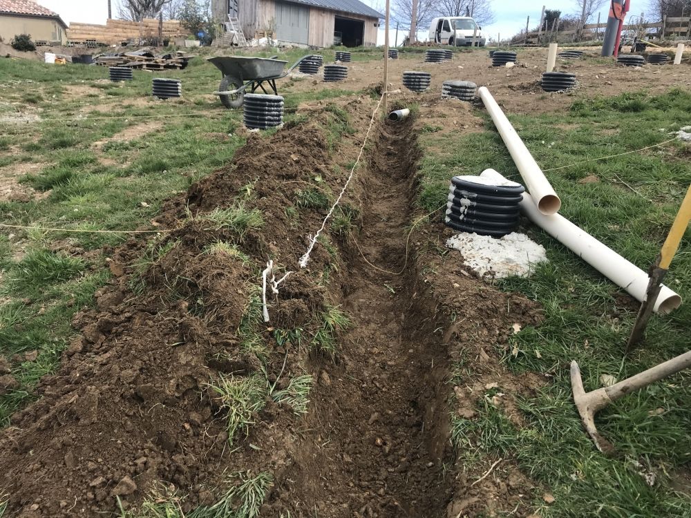 « Avoir une ventilation naturelle m’a paru être une évidence. Chaque espace possède a minima une fenêtre, il y en a neuf en tout ! L’une n’avait pas était prévu à l’origine et puis elle a été ajouté par l’équipe d’HeliYourte. Les ouvertures sont évidemment le système de ventilation principal. Pour ce qui concerne le puits canadien, c’était mon initiative. Il faut le faire, ça devrait être une obligation ! Dans notre écosystème, la géothermie est l’une des rares choses les plus stables : la température sous nos pieds est la même tout au long de l’année (autour de 12-13°) alors pourquoi ne pas s’en servir ? De plus, la mise en oeuvre d’un puits canadien n’est pas si difficile. Ça a été la première étape de mon chantier : j’ai tracé les 26 mètres sur mon terrain et puis, j’ai appelé un voisin auto-entrepreneur, pour qu’il creuse la tranchée de 1,5 – 1,8 mètre de profondeur. C’est quand même un sacré chantier, je n’avais pas imaginé que c’était aussi grand ! Il y a eu beaucoup de pluie en 2020, alors il a fallu pomper la tranchée à plusieurs reprises avant de pouvoir placé les tuyaux. Comme la tranchée avait été pour le puits canadien a été, j’en ai profité pour faire passer les tuyaux d’eau et d’électricité. Tout était installé en même temps, cela veut dire qu’il y avait les trois corps de métier en même temps sur le chantier : c’est tout un travail de coordination !