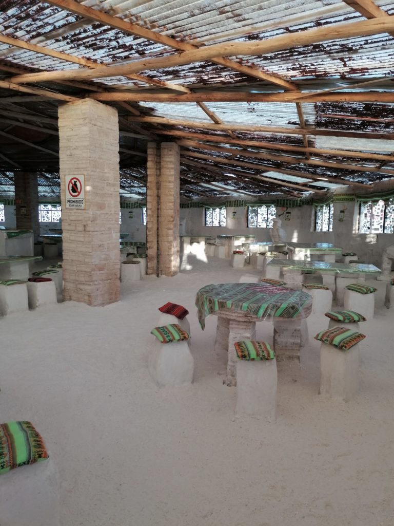 C’est le cas du bâtiment dans lequel notre guide Ruben nous a conduit pour la dernière nuit de cet inoubliable road trip. L’auberge s’avère être construite intégralement à partir de blocs de sel : les sols, les murs, et même les meubles sont de sel ! Ainsi, chaque table, assise ou même lit est taillé à partir de blocs de sel.