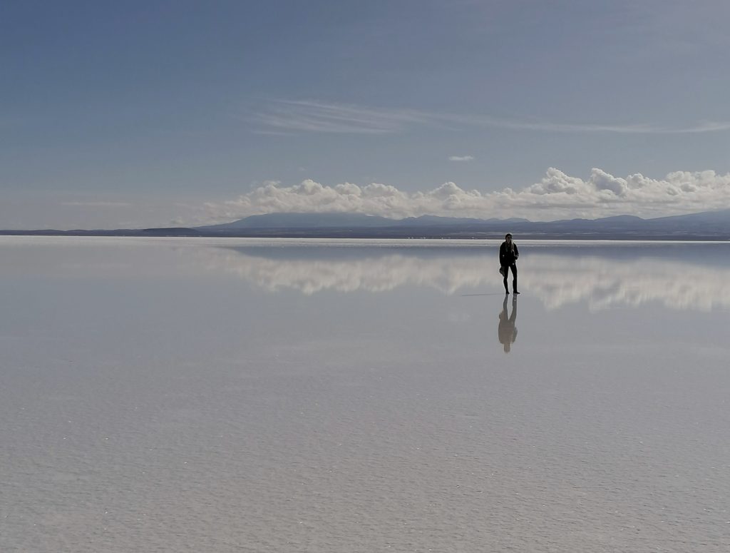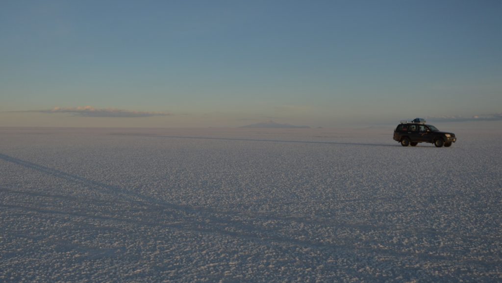 Lorsque nous partons à la découverte du Salar en ce quatrième jour de road trip après la traversée des paysages du Sud-Lipez, le jour se lève à peine et le décor semble en effet se prolonger à l’infini. Les quelques lumières des habitations et villages alentours s’éloignent peu à peu et il devient impossible de distinguer de quelle direction nous sommes partis. Nous observons l’immensité qui nous entoure. Une vaste étendue, plate et irrégulière, s’étire sur des milliers de kilomètres carrés. Pourtant ce n’est pas un océan, mais un désert. Un désert de sel. Seule la ligne d’horizon est perceptible de part et d’autre de cette immensité contenue entre le bleu du ciel et le blanc du sel.