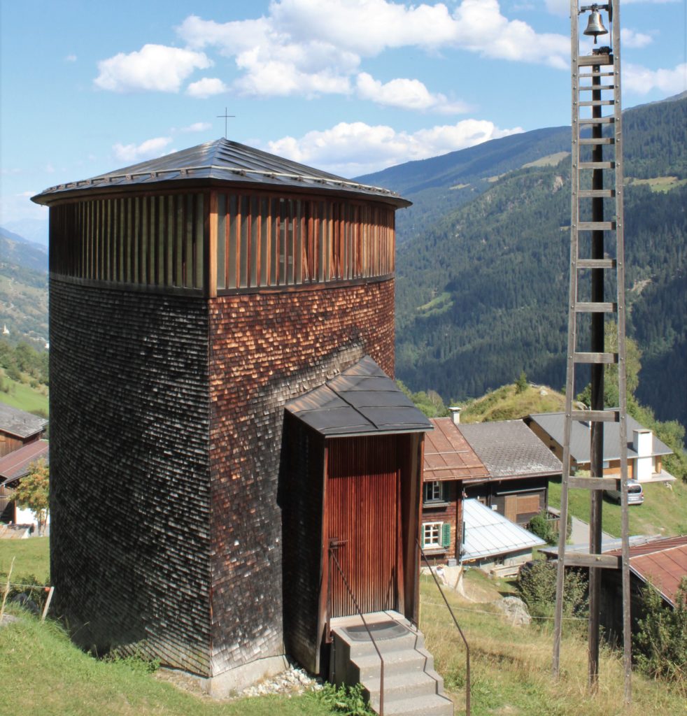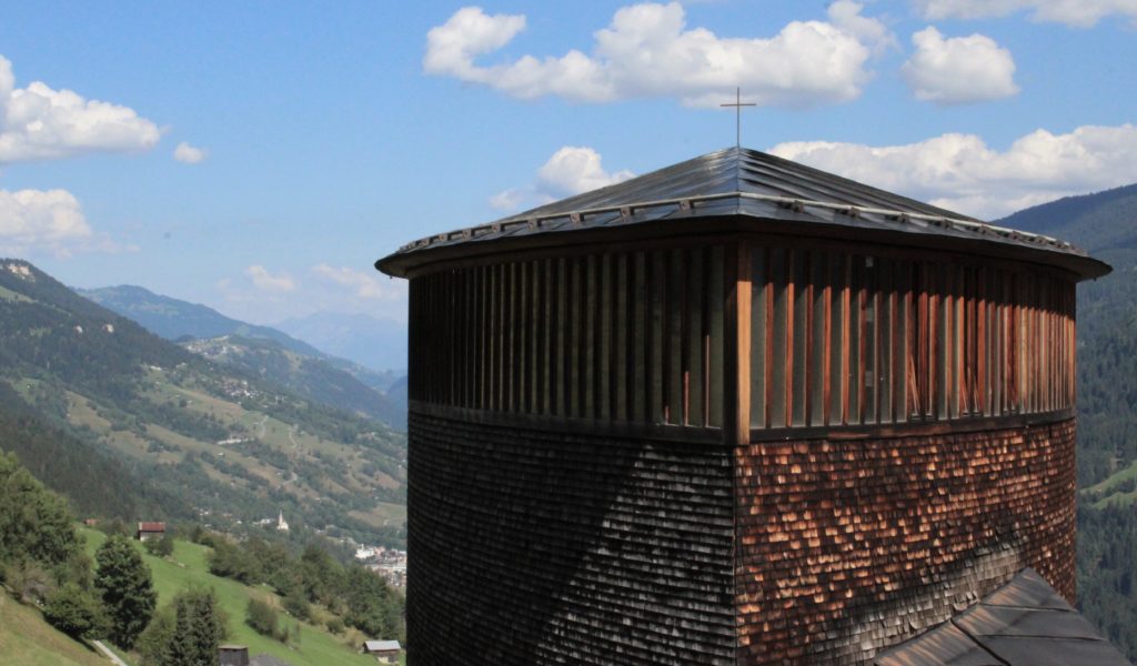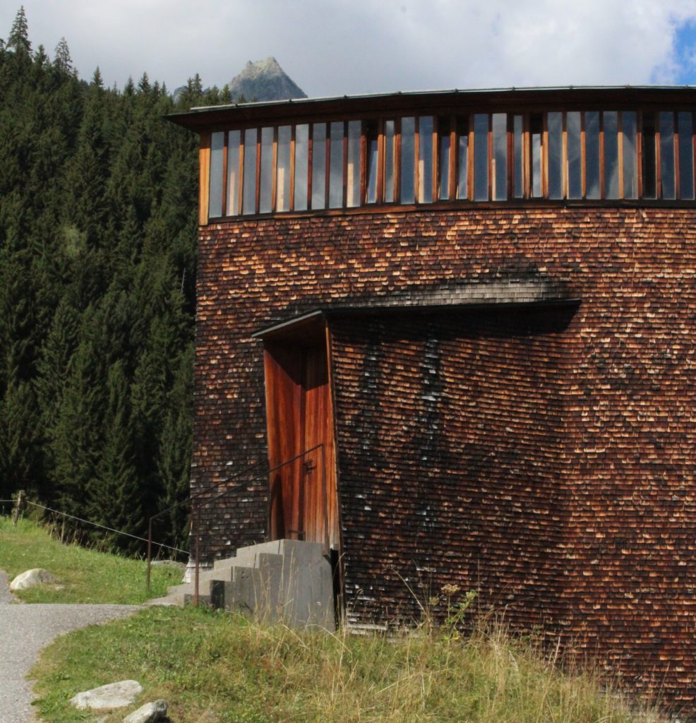 Notre premier arrêt se fait dans le hameau de Sogn Benedetg non loin du village de Sumvitg. Je ne vous emmène pas dans ce lieu par hasard, c’est ici que se situe l’une des premières réalisations architecturales de Peter Zumthor, par ailleurs architecte lauréat du prix Pritzker en 2009. Il s’agit donc de la chapelle Sogn Benedetg construite en 1988. Elle a été construite suite à une avalanche de 1984 qui a détruit l’ancienne chapelle de style baroque du village. Ce nouveau site, à flanc de colline, offre une vue dégagée sur les montagnes environnantes mais protège également l’édifice de futures avalanches par la proximité immédiate avec la forêt.
