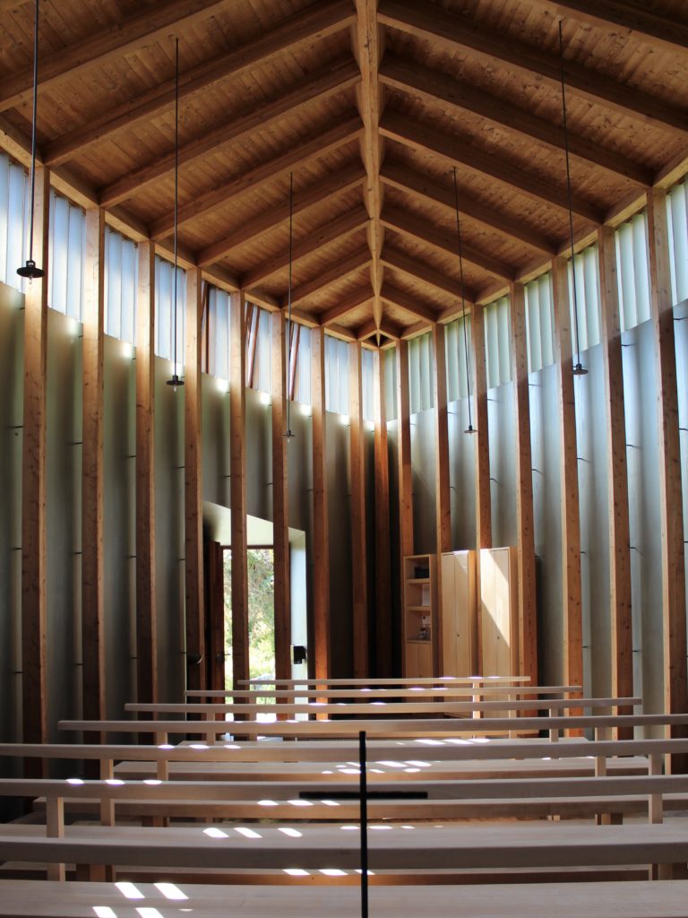 Puis, sur les hauteurs du hameau, au détour d’un petit sentier en lacet, la chapelle se dresse tout à coup devant nous. Suivant la pente naturelle du site, la forme ovale du plan de l’édifice se définit difficilement depuis l’extérieur. Un volume courbe est perceptible, duquel ressort un plus petit volume qui vient marquer le seuil de l’entrée. La figure du clocher se positionne indépendamment du volume et vient fabriquer un élément vertical également en bois.
