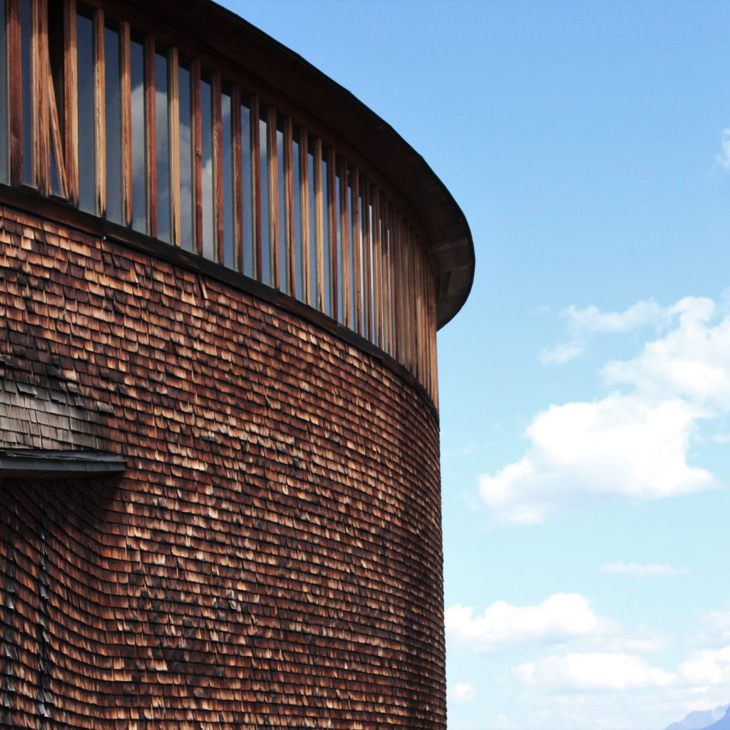 Les multiples tavaillons de mélèze, soit les tuiles de bois qui recouvrent les façades, donnent littéralement vie à l’édifice. Ces éléments de bois changent de teintes au gré des jeux d’ombre et de lumière que nous offrent les éclaircies soudaines.