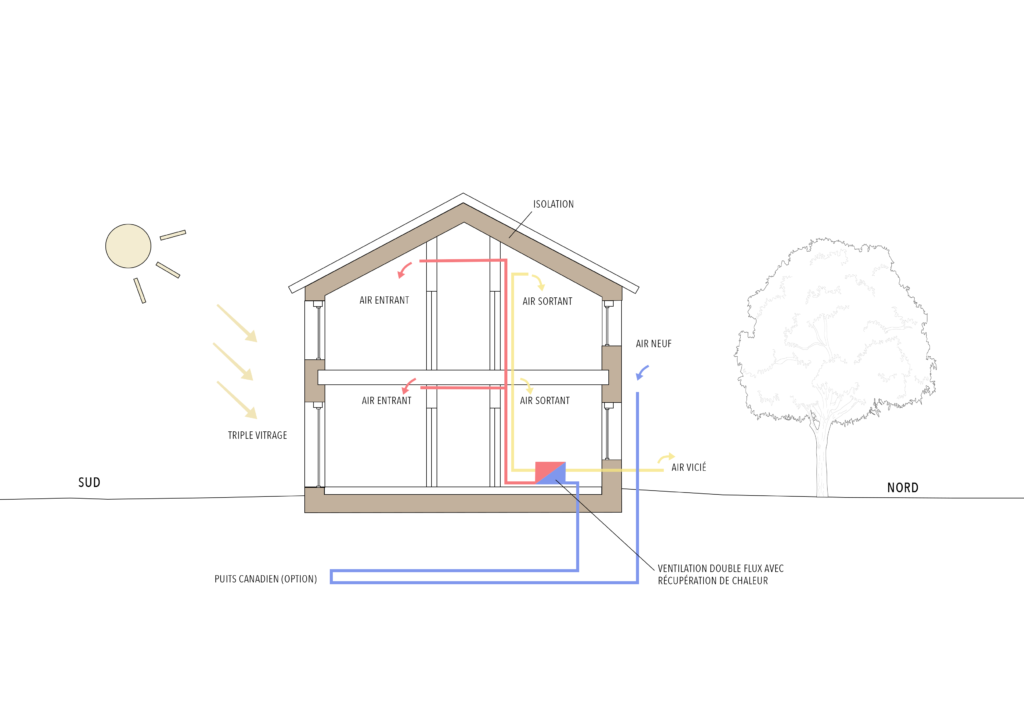 Du fait de cette grande imperméabilité, les maisons passives disposent d’un système de ventilation à double flux. Fonctionnant en continu, il permet de ventiler et d’équilibrer la température de l’air entrant dans le logement. Ce système mécanique peut par ailleurs s’accompagner de la mise en place d’un puit canadien.