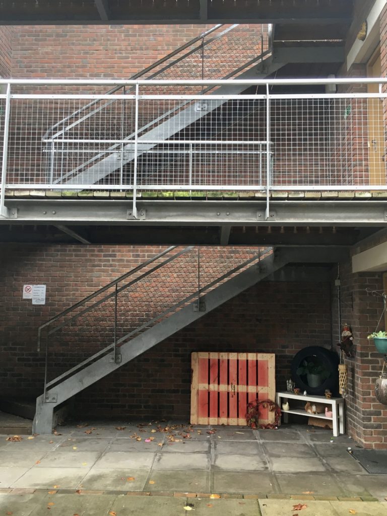 Les traces laissées dans le voisinage font apparaître la vie de communauté : les chaises de jardin sont restées dehors, tout comme les jouets des enfants et les cendriers de la veille encore disposés sur la large table communale. Il semblerait que la pluie ait fait fuir les résidents qui profitaient de l’extérieur.