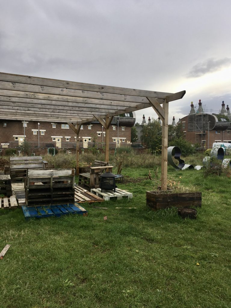 Sûrement que le paysage vert y participe, ceux qui habitent au rez-de-chaussée entretiennent leurs petits jardins tandis que ceux qui vivent dans les étages se sont appropriés le toit végétalisé. Les balcons et terrasses regorgent de plantes en pot et de potager en caisse. Le quartier en lui-même profite d’allées arborées, d’un grand terrain d’herbe ou d’ailleurs s’est installé sous le auvent une terrasse et du mobiliers en palette. Tout au fond de la parcelle se cache potager partagé bien alimenté !