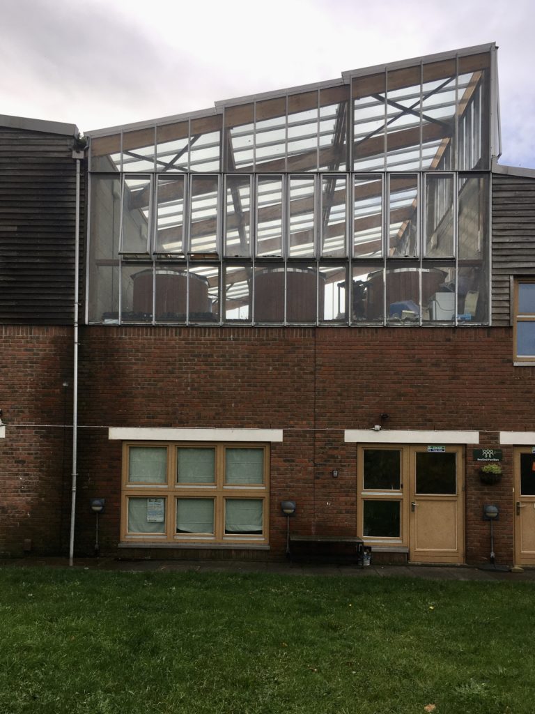 L’un des bâtiments se démarque, à l’écart des habitations, il se diffère dans ses proportions. Les grands vitrages appellent à regarder ce qu’il s’y passe. Derrière ces fenêtres, quelques personnes rangent des déguisements d’Halloween. La spacieuse salle-multifonctions, habituellement utilisé pour les sports d’intérieur a été réquisitionné pour réceptionner un événement de saison. Une autre façade vitrée se révèle être la devanture d’un magasin de plantes. L’épaisseur du bâti laisse à penser que d’autres salles à usage collectif s’y cachent.