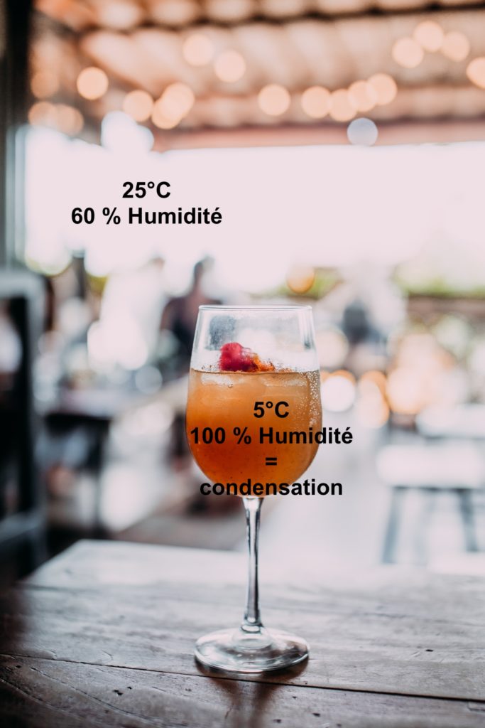 C’est exactement le phénomène qui se produit quand votre verre au bar se pare de jolies gouttelettes en surface : il fait 25°C dehors, votre verre est à 5°C donc localement, sur le verre l’eau se condense.