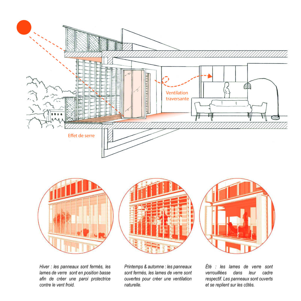 Nous y retrouvons là aussi le principe de prolongement de l’espace de vie vers l’extérieur à travers un système de loggias équipées de persiennes à lames de verre orientables. Celles-ci font office de régulateur thermique, et induisent ainsi des usages différents selon les temporalités.