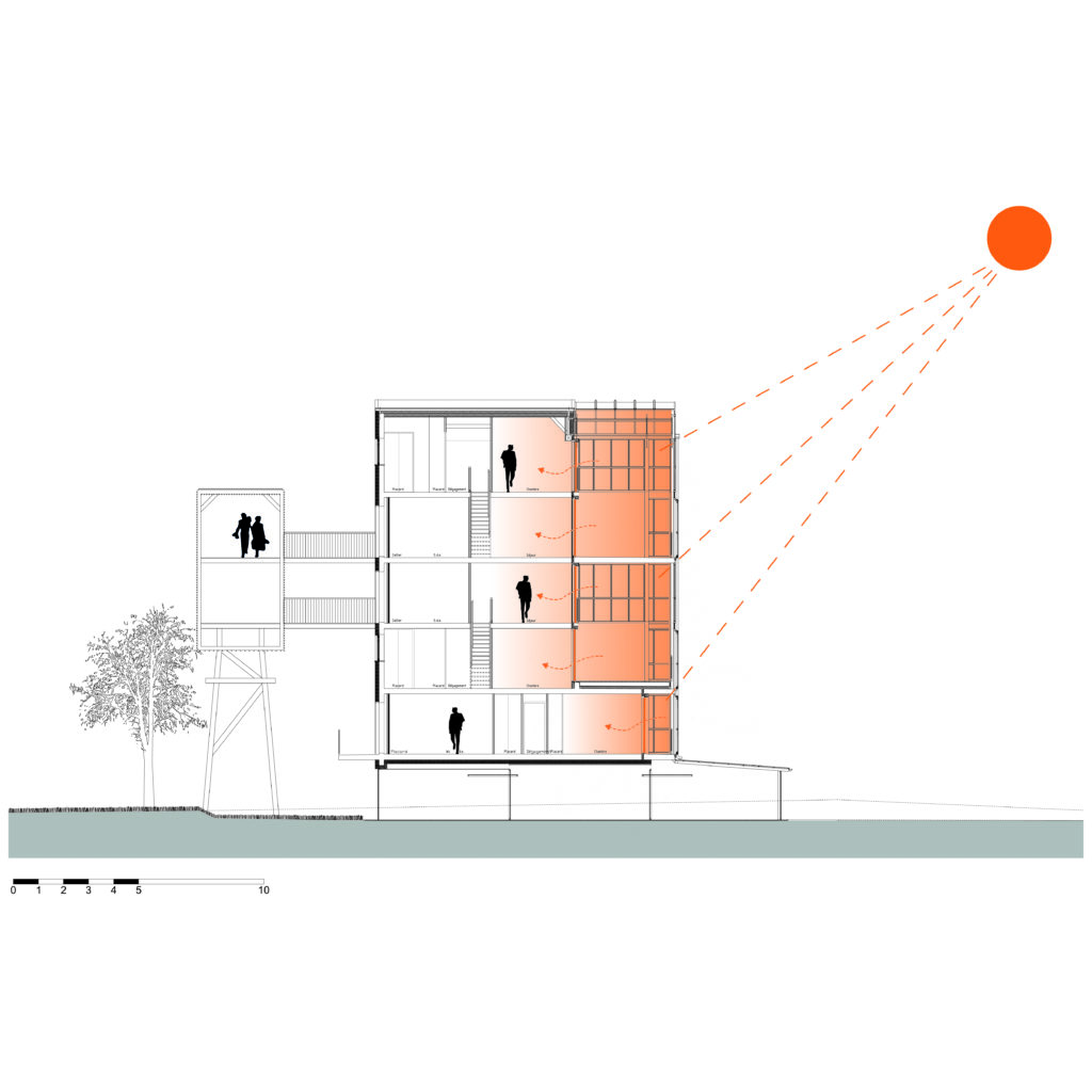 Coupe transversale sur la serre bioclimatique, opération Amplia ©Orlane Huitric