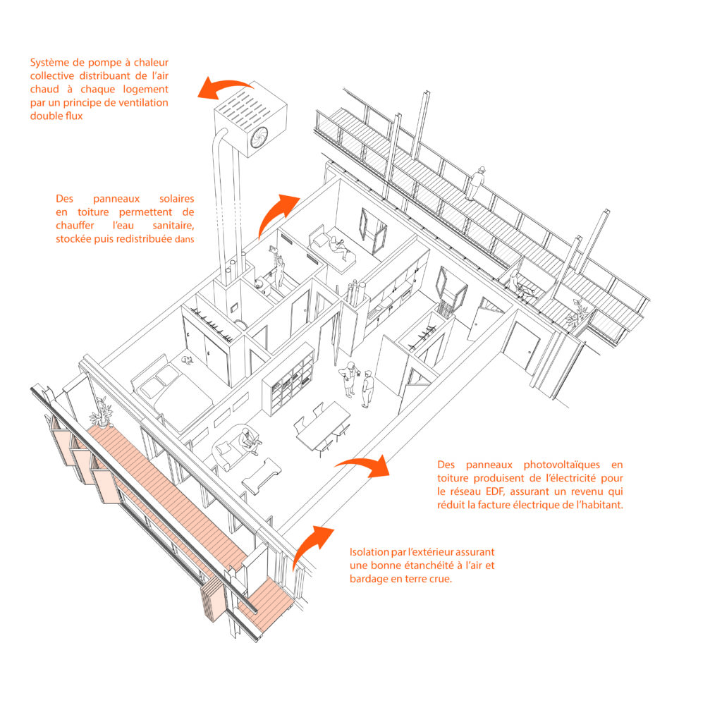 Si l’on devait comparer avec l’opération nantaise, le peu d’équipements techniques à appréhender par ses usagers ne vient-il pas jouer en faveur de son fonctionnement hivernal ? En effet, dans l’optique d’un projet à économies de moyens, il s’agit simplement d’une ventilation simple flux ne demandant pas aux individus de la gérer manuellement, à l’inverse de la double-flux d’Amplia.