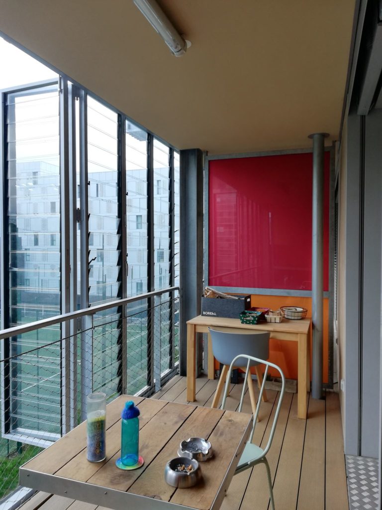« La loggia, c’est super. Par contre, je n’apprécie pas l’architecture avec les vitres, c’est en accordéon, l’entretien est difficile du fait du nombre de lames de verre. Puis, cet été, il a fait très chaud, même en fermant les stores. Je n’ouvre jamais les 4 panneaux, […] les portes sont lourdes.»