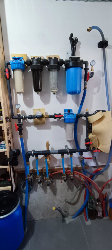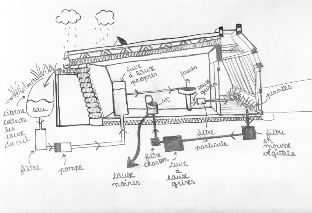 Dans les earthships un des principes fondamentaux repose sur le circuit de l’eau. L’eau étant un élément vital, elle doit toujours être en suffisance dans la maison. Celle-ci est récupérée du ciel et est ensuite filtrée pour un maximum de quatre utilisations avant d’être évacuée naturellement. Attention, cette eau ne deviendra jamais de l’eau potable. Depuis le toit, l’eau subit d’abord, une grossière filtration au travers d’un limon de graviers et est canalisée à travers les liaisons de drain de gravier vers les citernes. Stockée dans des bacs de rétention (dimensionnés selon les besoins liés à la localisation), l’eau est à l’abri des rayons du soleil. La citerne est munie d’une pompe et d’un filtre. L’eau est poussée par la pompe vers d’autres filtres qui vont finalisés son état. Propre, celle-ci sert à un usage quotidien, comme la douche ou la vaisselle, à l’exception des toilettes. Les eaux grises sont récupérées, filtrées à nouveau par des cellules botaniques intérieures et réutilisées pour les sanitaires (la chasse d’eau). Les eaux grises deviennent des eaux noires, elles sont séparés du système de drainage et de la plomberie domestiques pour être traitée une dernière et quatrième fois dans des cellules botaniques extérieures.