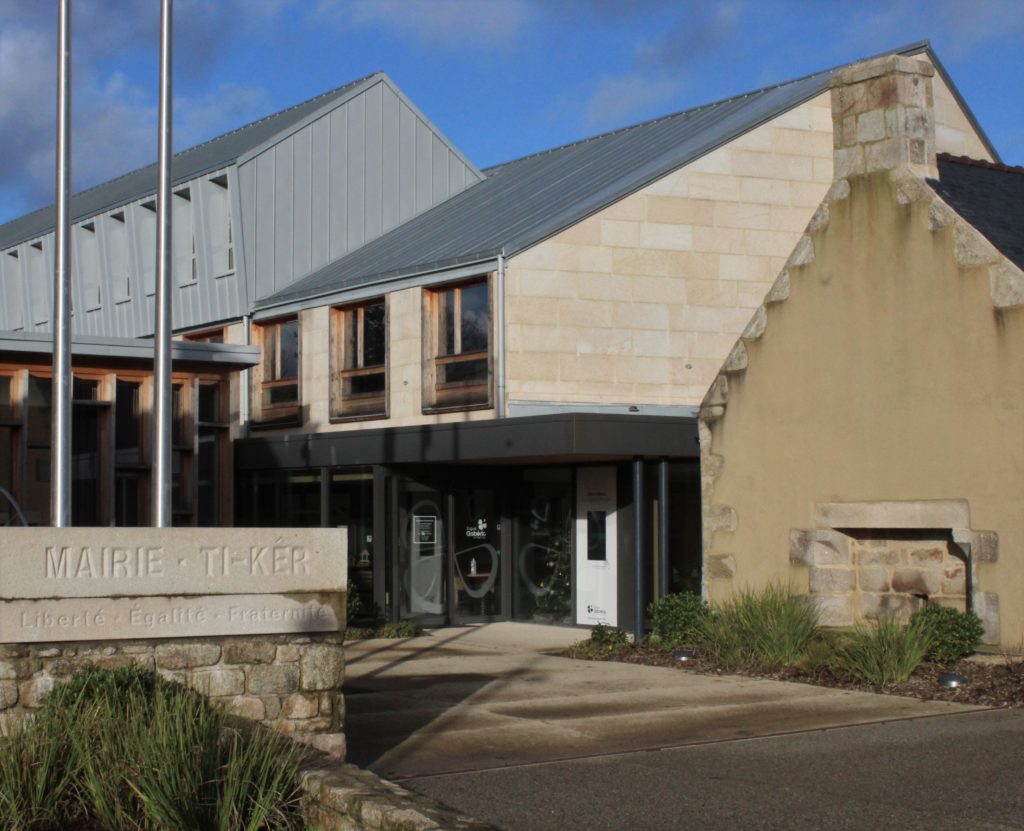 L’entité administrative, construite en pierre massive, s’organise, elle, sur 3 niveaux. Les pierres de l’édifice sont issues d’un granit qui a été extrait et taillé à moins de 15km du chantier. L’agence Grignou Stephan affirme avoir « porté une attention particulière au patrimoine du bourg mais aussi à la matérialité des choses, au savoir-faire des professionnels et à l’origine des matériaux. Par exemple, les pierres de granit proviennent d’une carrière de Pluguffan et les huisseries en bois de la menuiserie Lautridou, de Plomelin. »