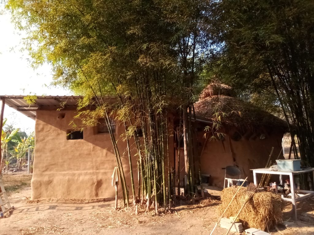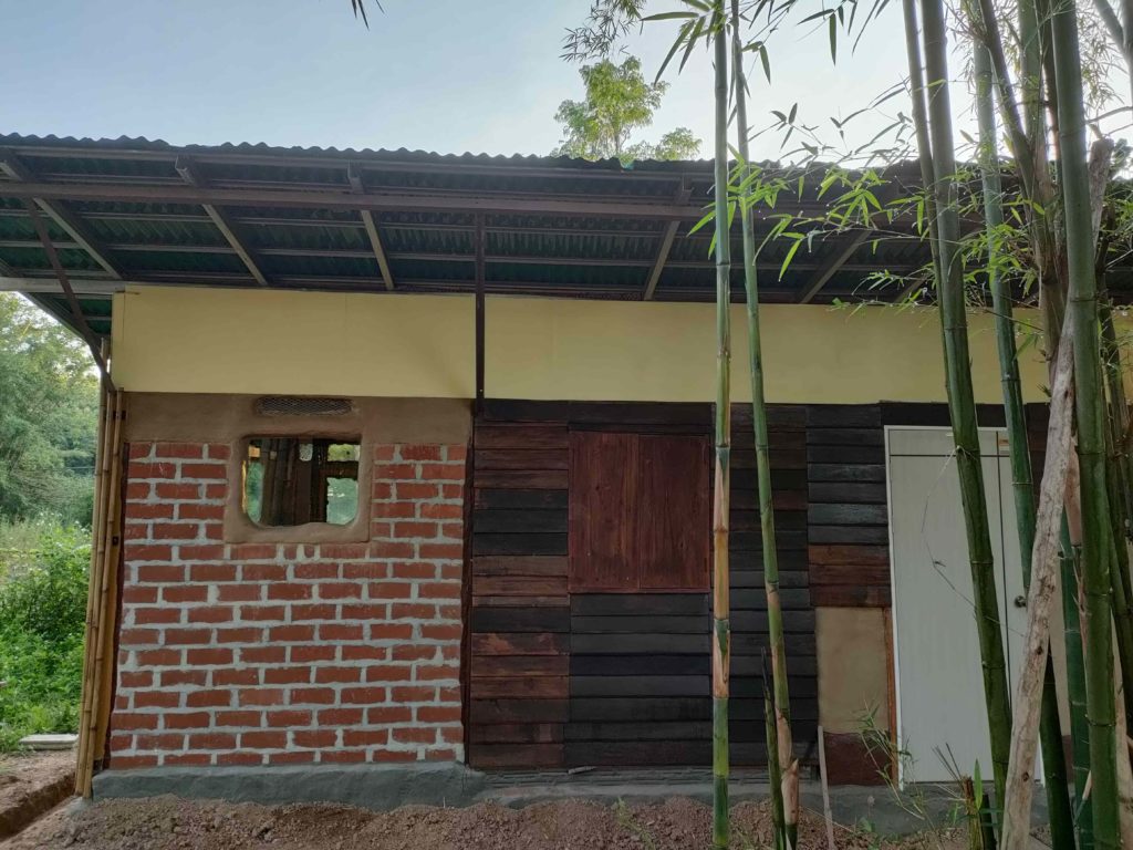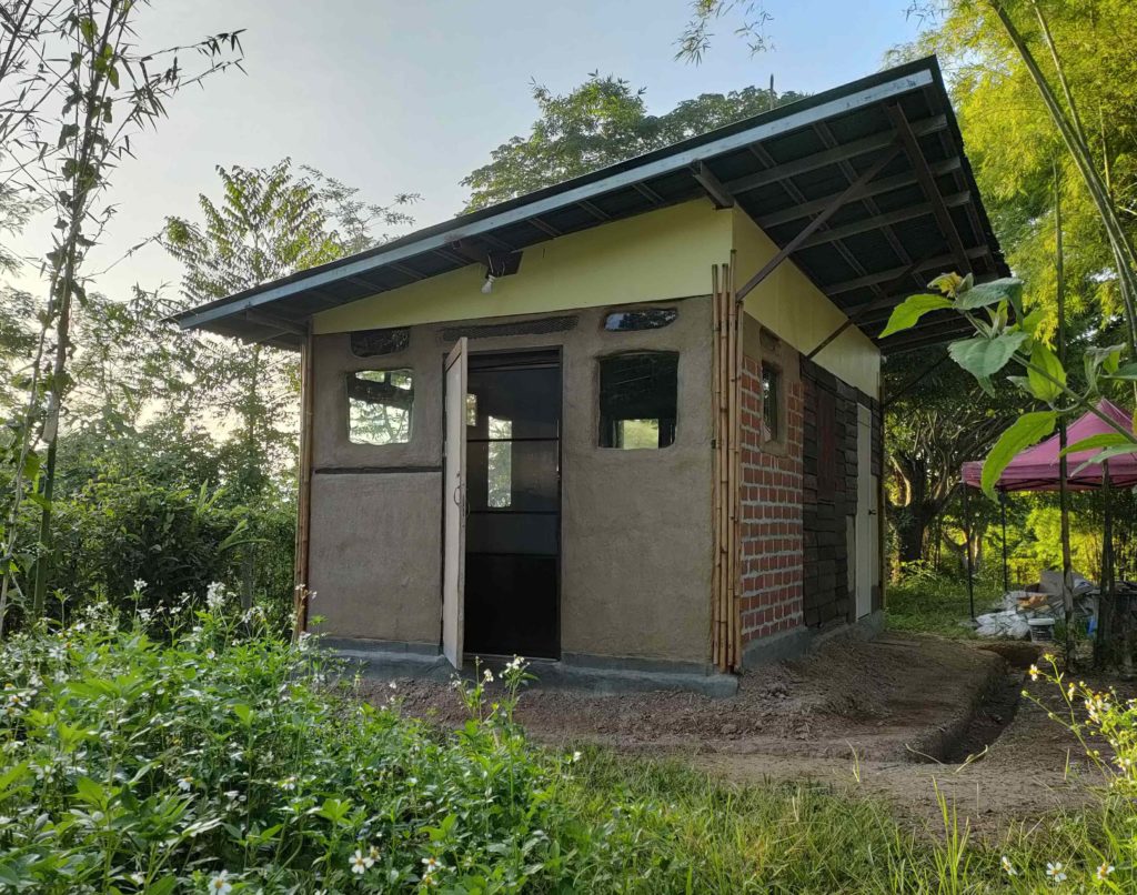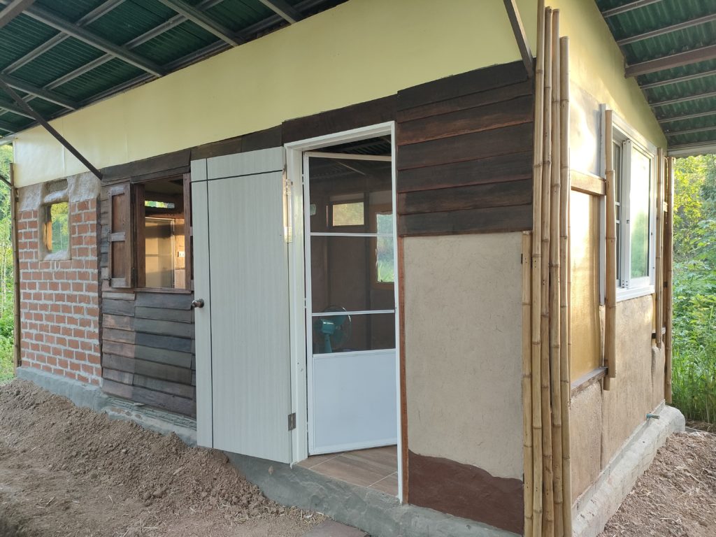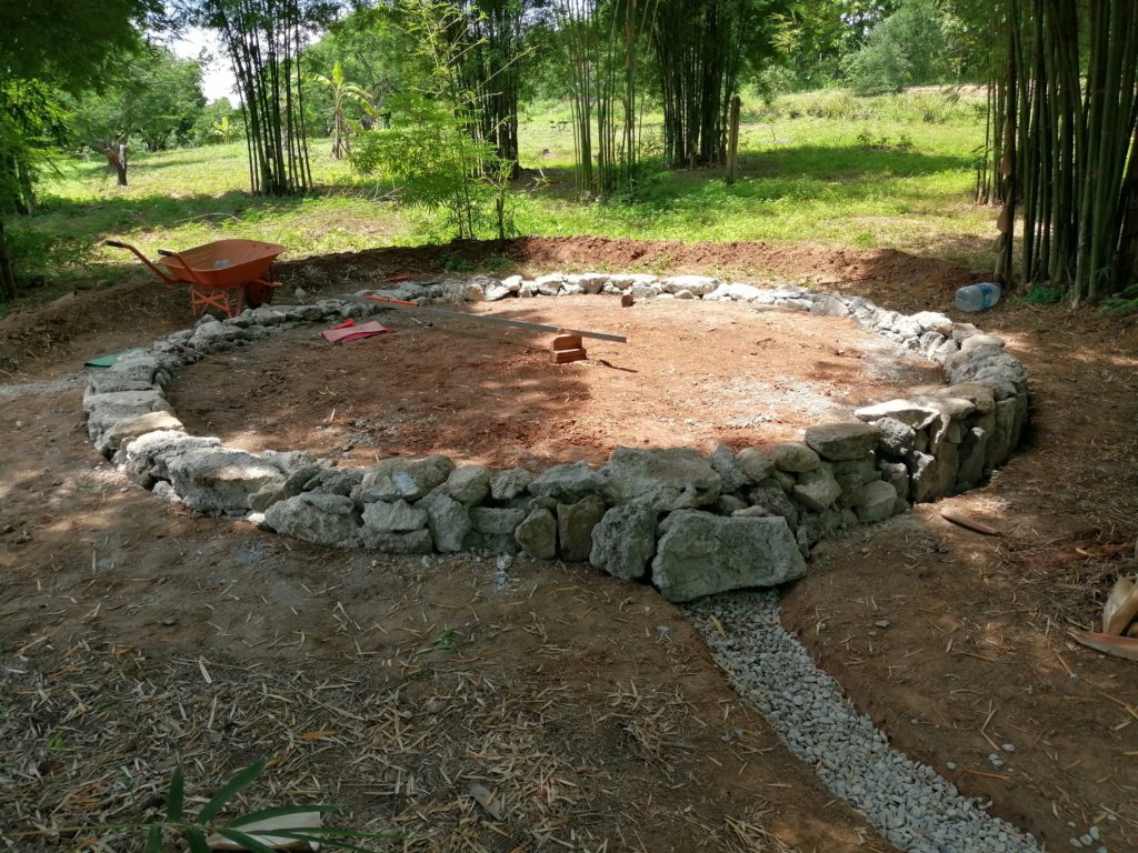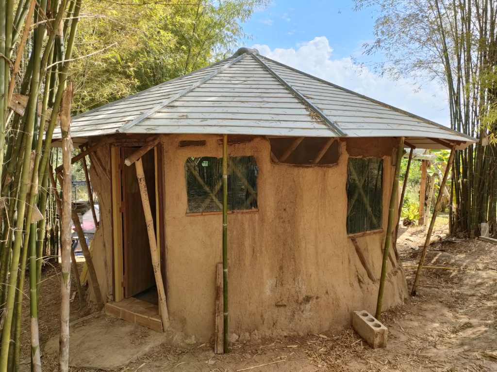 La première construction sur leur nouveau terrain démarre en novembre 2019 : une yourte en bambou, attenante à une chambre de 16 m², faîtes de murs en terre, destinée à accueillir stagiaires et visiteurs.