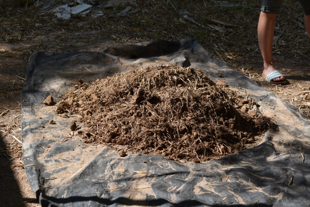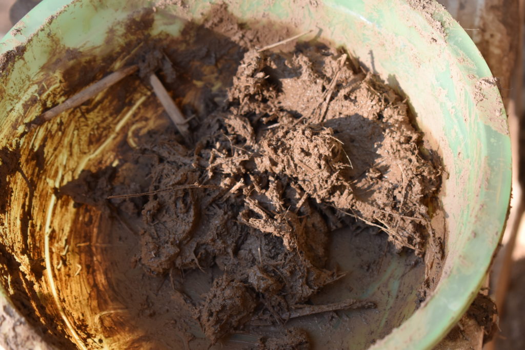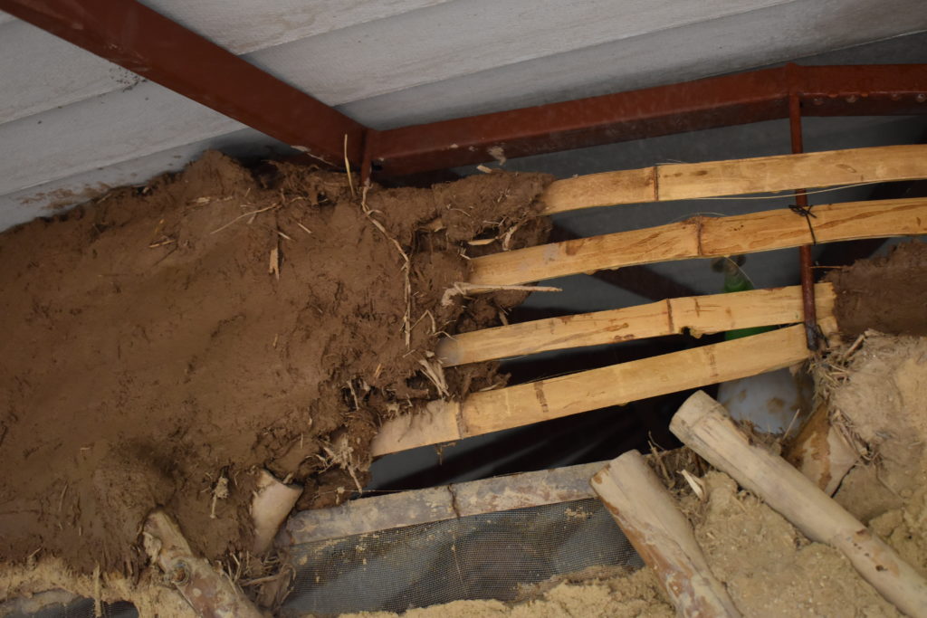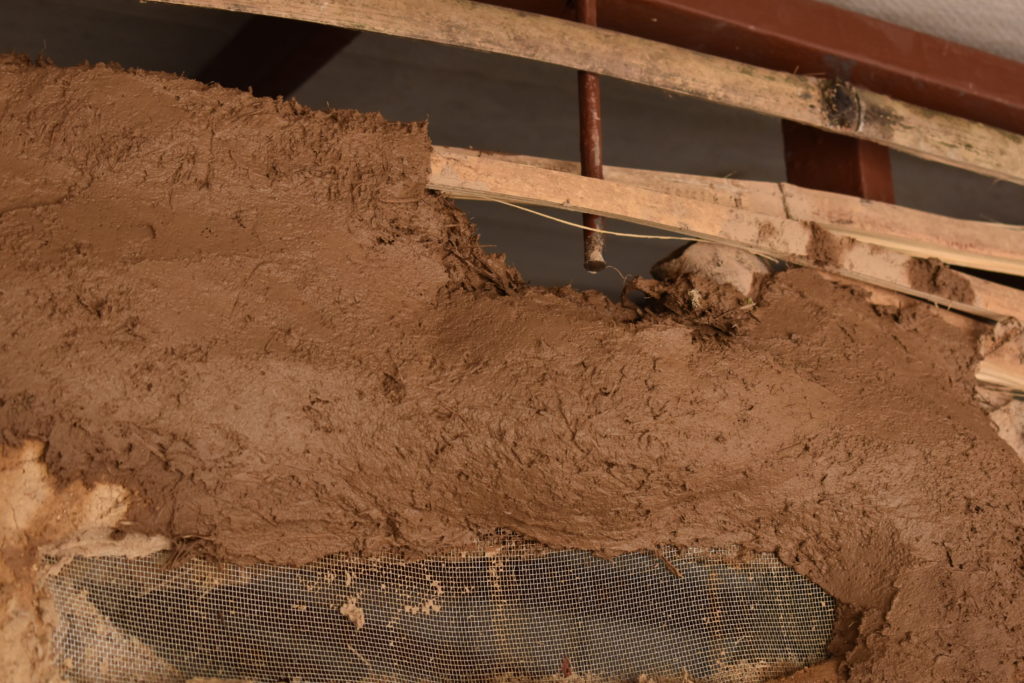 La recette du torchis ? Chaque torchis est unique et dépend des matériaux que l’on a à disposition ! Dans le cas de la yourte, le mélange se constitue de terre, sable et eau dans les quantités suivantes : 10 seaux de terre pour 5 seaux de sable et 2 à 3 seaux d’eau. Les fibres que l’on y ajoute sont de la paille (env. 20cm de long max). Le mélange est appliqué directement sur la structure en bambou du mur, après avoir modelé une sorte de galette que l’on presse fermement autour des bambous. Peu à peu, le mur est complété de ce mélange assez malléable. On le malaxe, le lisse au doigt ou à la truelle, du haut vers le bas, pour toujours le lier avec le mur de terre déjà sec. Par la suite, un premier enduit servira à uniformiser la surface et cacher les quelques fissures superficielles. Puis un enduit de finition apportera la touche esthétique et protègera, à l’extérieur, de la pluie, et à l’intérieur des effets à long terme : frottements et impacts éventuels.