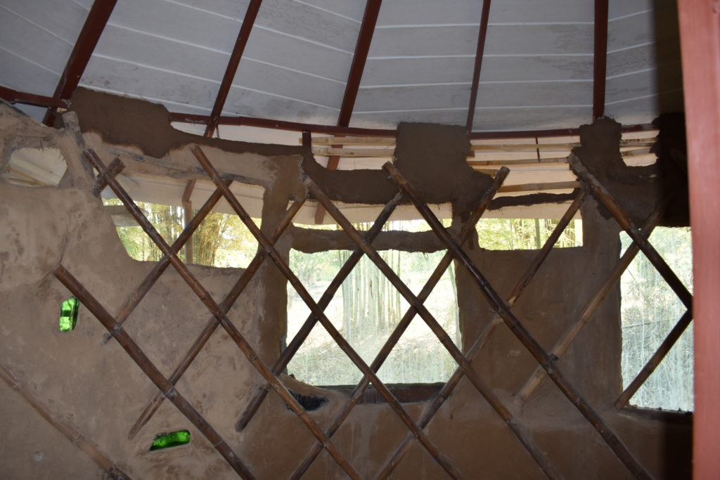 Ici, sur des fondations en dur, sont fixés les bambous. Le toit que l’on peut observer aujourd’hui n’est pas le premier, qui était en chaume et manquait d’étanchéité. La yourte est raccordée à un autre bâtiment en terre crue (pièce de nuit) et constitue la future pièce de vie. Les murs ont été montés très progressivement avec la technique Wattle et Daub (torchis en anglais). L’idée c’est que la structure bambou, qui supporte elle-même un système de tressage, est enrobé d’un mélange terre – fibres… Sur ces murs, j’ai testé différents mélanges, notamment à base de terre, de tapioca voire de plâtre, plusieurs dosages, différentes applications… Les liants et fibres ont aussi varié sur certains pans de murs, les enduits sont à base de balle de riz (enveloppe du grain de riz), le torchis à base de paille de riz… »