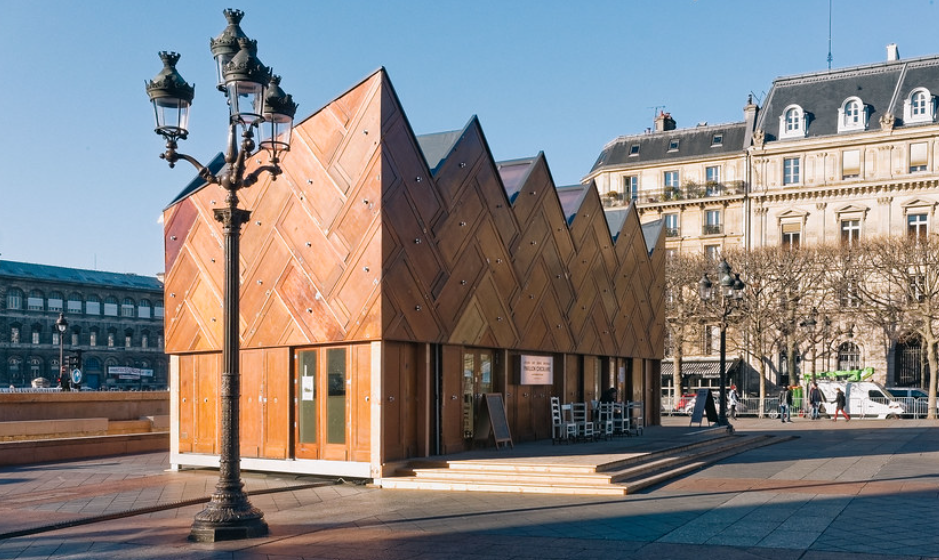 Cet édifice singulier, nommé « le pavillon circulaire » et réalisé à l’occasion de la COP21, n’est pas passé inaperçu sur le parvis de l’Hôtel de Ville de Paris. Conçu par Encore Heureux Architectes, cette agence est reconnue pour d’autres projets à dimension sociale et écologique comme l’aménagement du tiers-lieu de la grande halle de Colombelles.